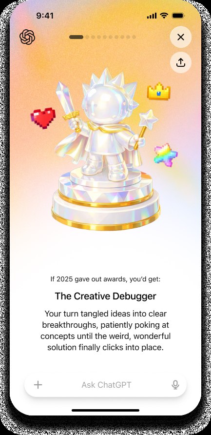 Az OpenAI év végi összefoglalója a jól ismert Spotify Wrapped (vagy bármelyik hasonló éves nagy összefoglaló) logikáját követi. Az élmény vizuális elemzés a felhasználó számára saját magáról, „díjakat” kaphatunk szokásainkért, és játékos formában ismerhetjük meg, mire használtuk leginkább a ChatGPT-t.