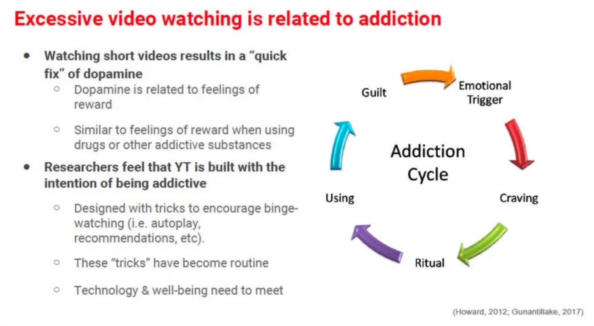 A prezentációban egy „függőségi ciklus” feliratú ábra is szerepel, amely azt mutatja be, hogyan vezethet egy érzelmi kiváltó ok, például a bűntudat, vágyakozáshoz, rituáléhoz és újabb használathoz. A dokumentumban az is szerepel, hogy a kutatók szerint a YouTube-ot úgy építették fel, hogy az addiktív legyen, és ebben olyan elemek játszanak szerepet, mint az automatikus lejátszás és az ajánlórendszer.